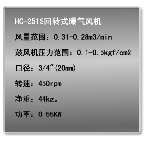 HC-251S回轉(zhuǎn)式流體風(fēng)機(jī)風(fēng)量范圍:0.31-0.28m3/min,鼓風(fēng)機(jī)壓力范圍:0.1-0.5kgf/cm2。電機(jī)功率0.55kw,口徑20mm,轉(zhuǎn)速450rpm,凈重44kg。